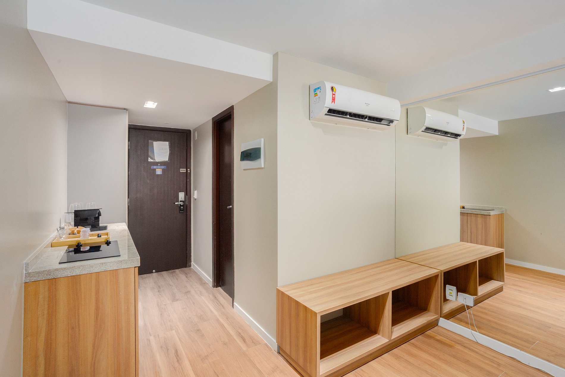 Equipada com frigobar, micro-ondas, cooktop e balcão