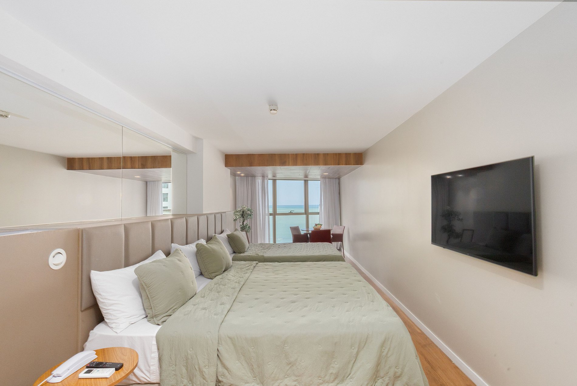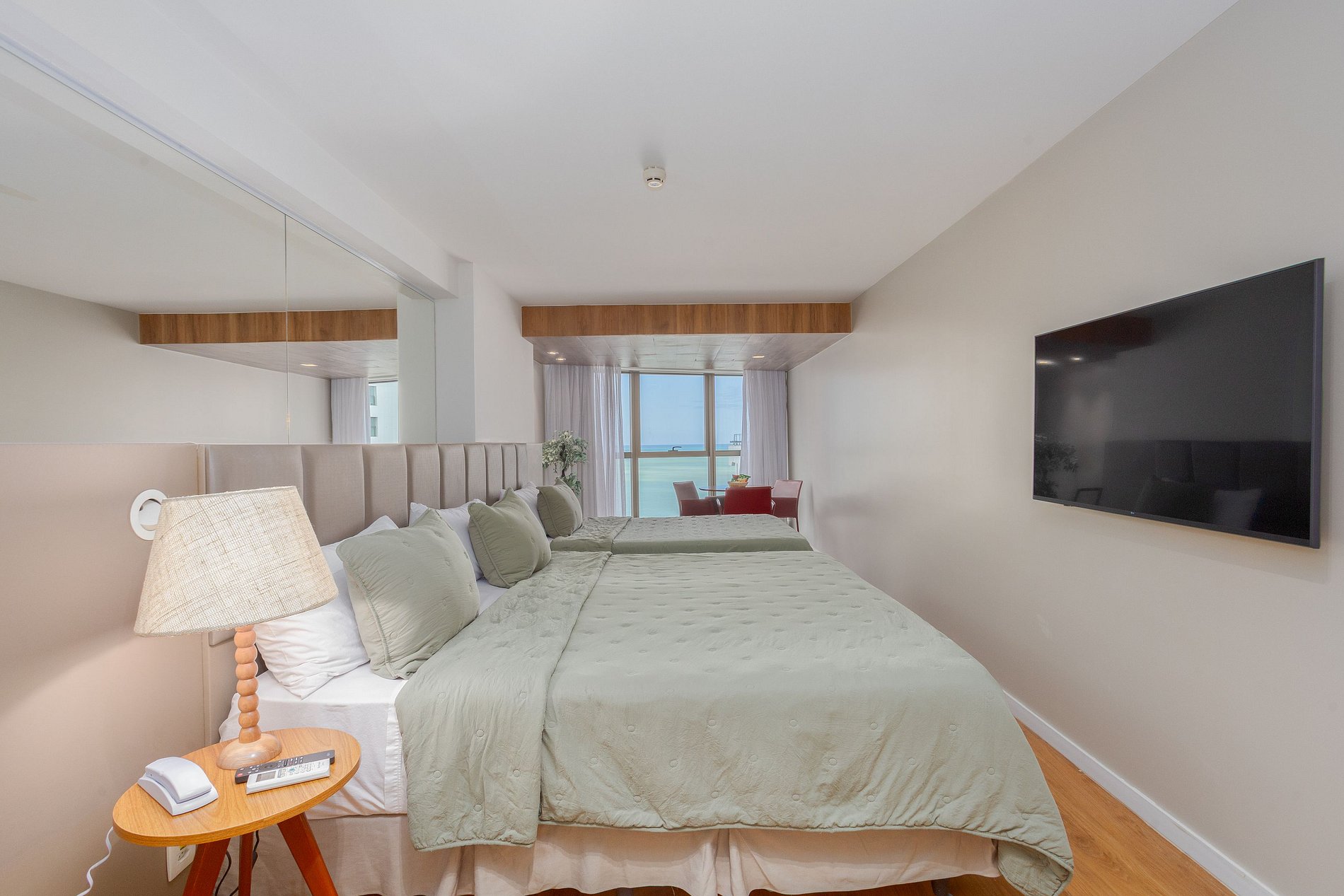 Suíte decorada por arquiteta, com vista deslumbrante da Praia de Boa Viagem, no 10º andar. Conta com cama king size, cama solteiro, Wi-Fi, TV smart, ar-condicionado, cooktop, iluminação aconchegante. Prédio com recepção 24h, restaurante, academia, sauna e estacionamento gratuito. Localização privilegiada, perto dos melhores bares, restaurantes e do Shopping RioMar. Perfeito para lazer ou trabalho.