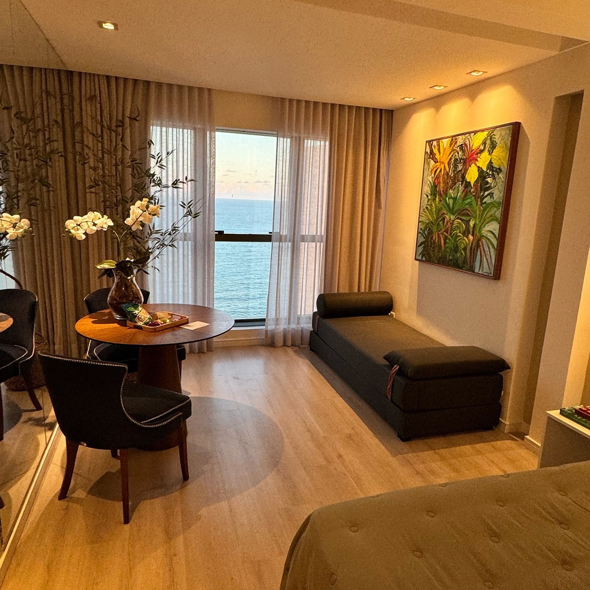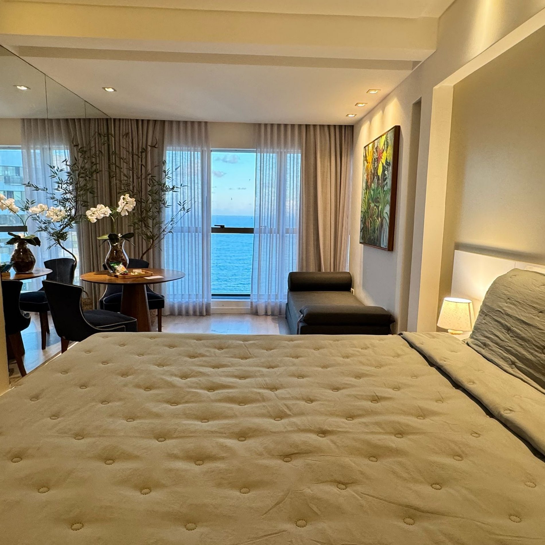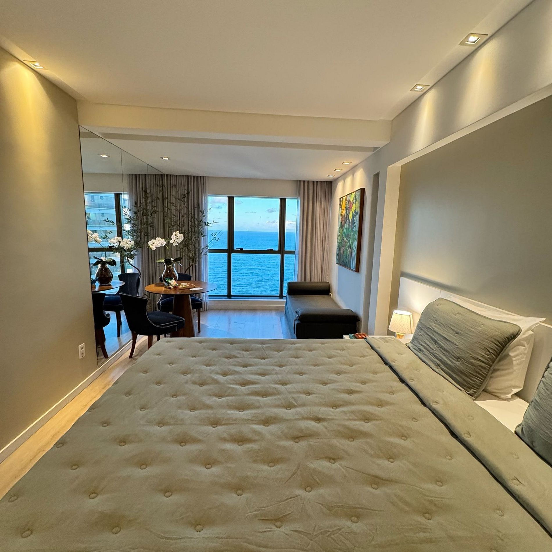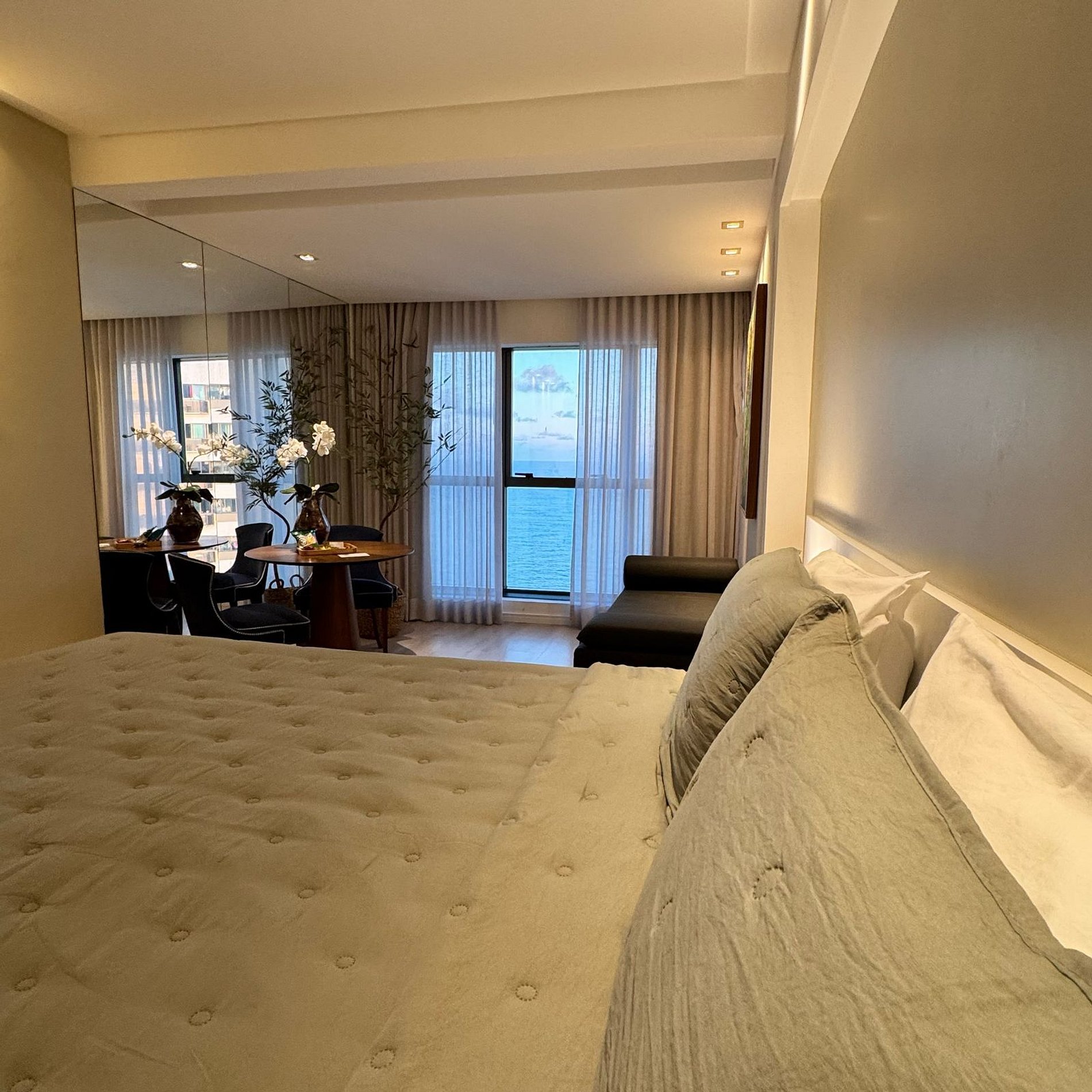Apartamento alto luxo com vista espetacular da Praia de Boa Viagem, decorado por arquiteta e localizado em andar alto. Conta com cama king size, sofá-cama, Wi-Fi, Smart TV, ar-condicionado e iluminação aconchegante. Prédio com restaurante 24h, recepção bilíngue, academia, sauna e estacionamento gratuito. Perto de bares, restaurantes, padaria, frutaria e Shopping RioMar. Ideal para relaxar ou trabalhar com conforto e estilo.