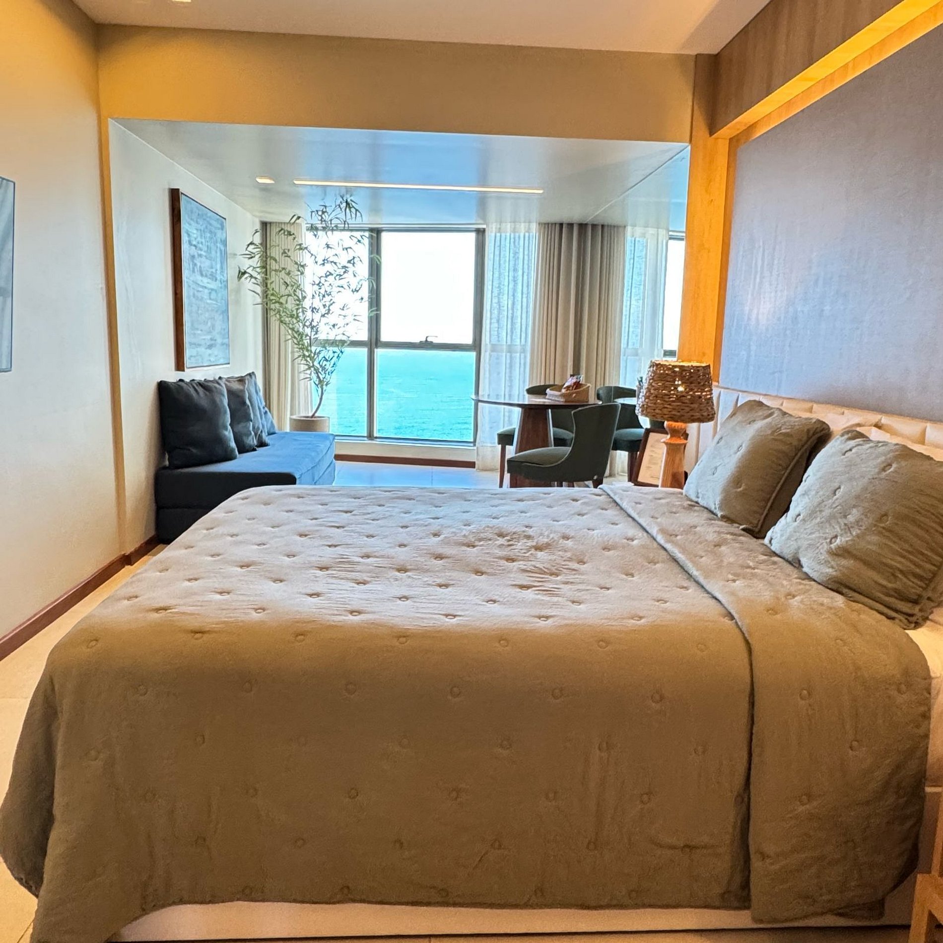 Apartamento decorado por arquiteta na praia de Boa Viagem, Recife, com cama king size, sofá-cama casal, TV Smart e Wi-Fi gratuito. O ambiente inclui sala de estar/jantar integradas, frigobar, micro-ondas, Split, cofre eletrônico e balcão com pia, com vista para o mar. O prédio oferece recepção 24h, academia, sauna, restaurante, serviço de quarto e estacionamento com manobrista. Localizado perto de shoppings, restaurantes, bares e com fácil acesso ao transporte (táxi, Uber).