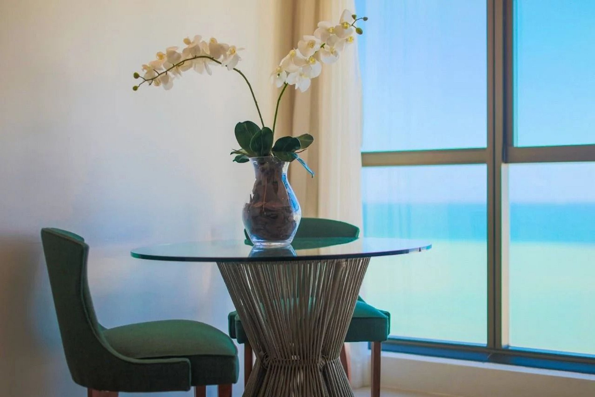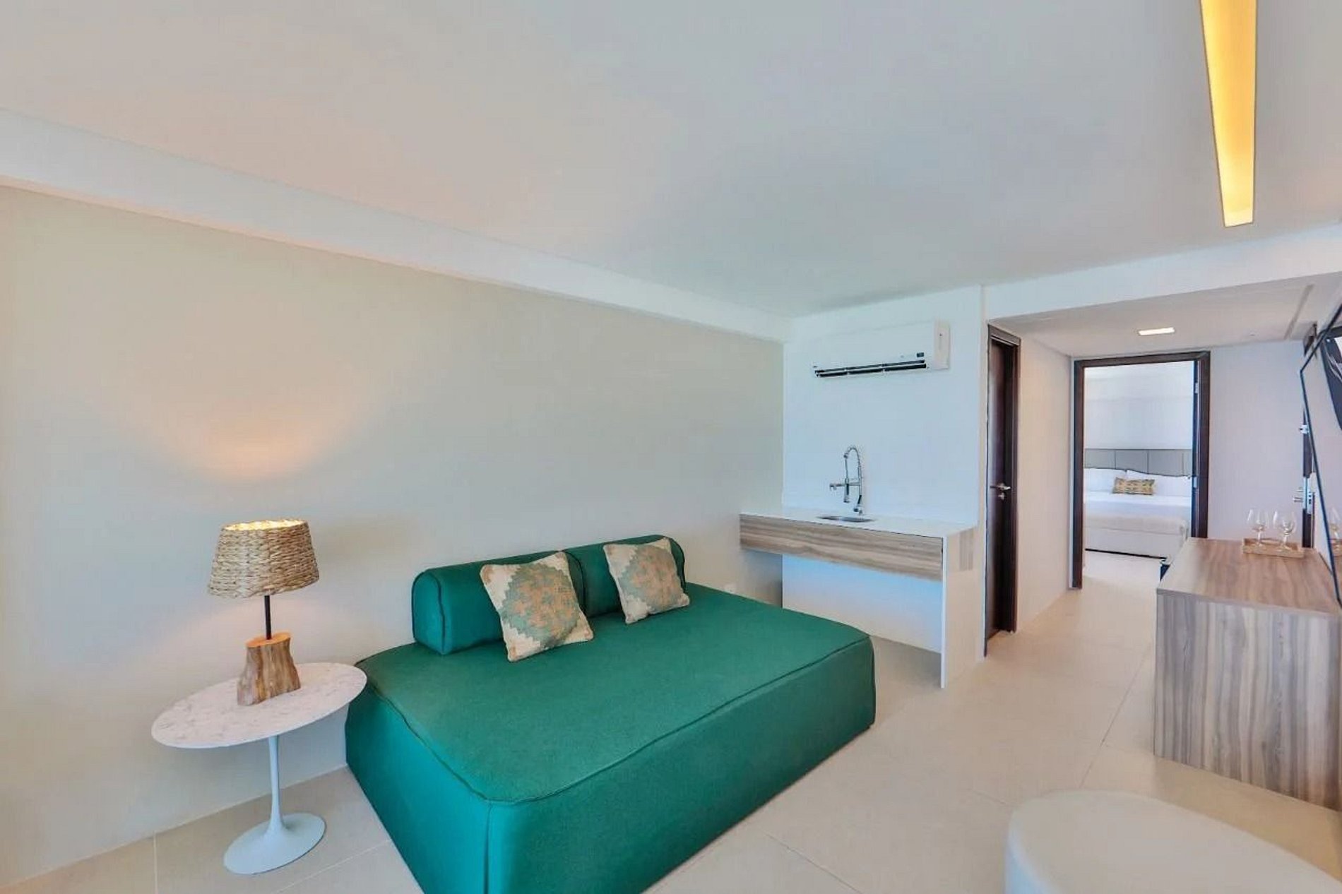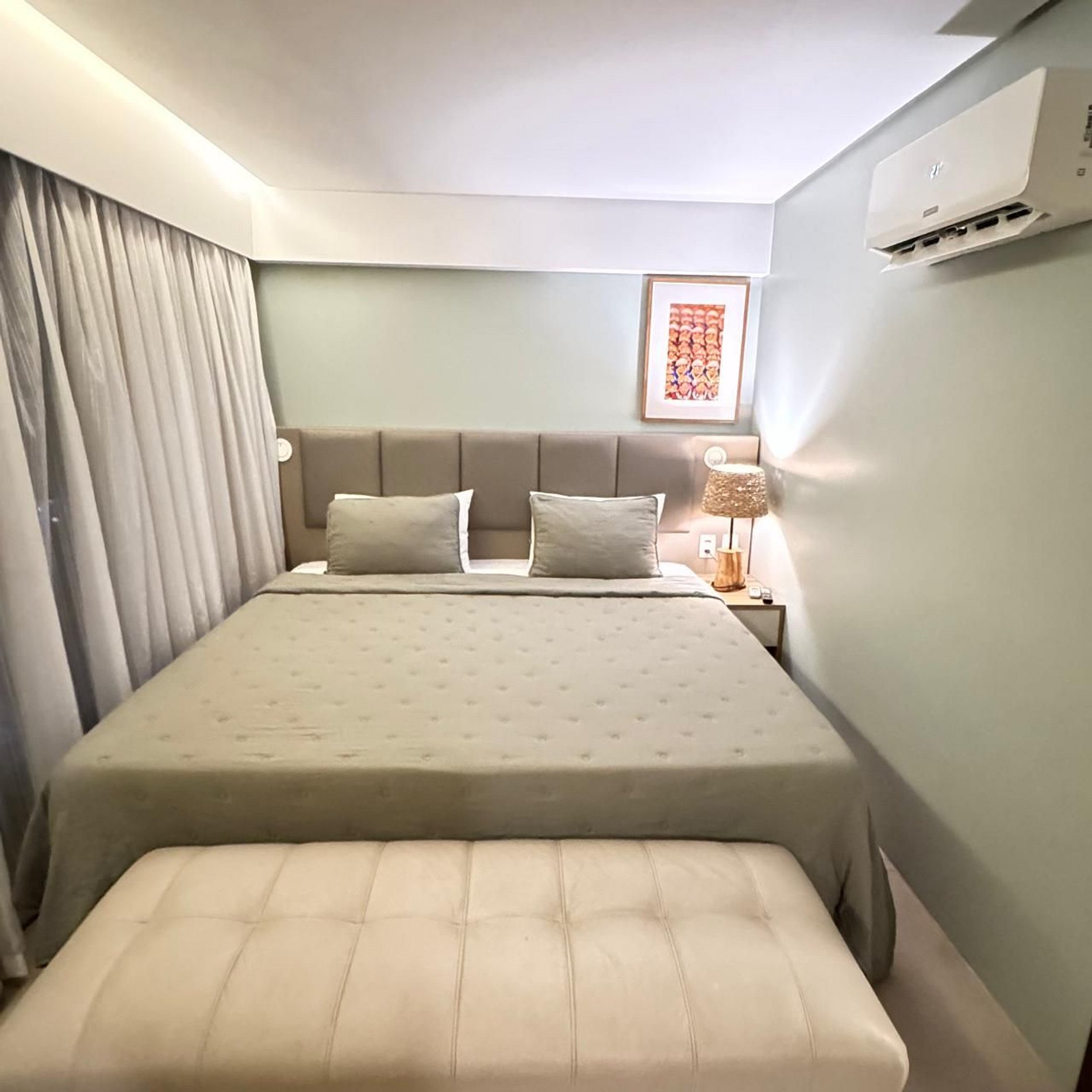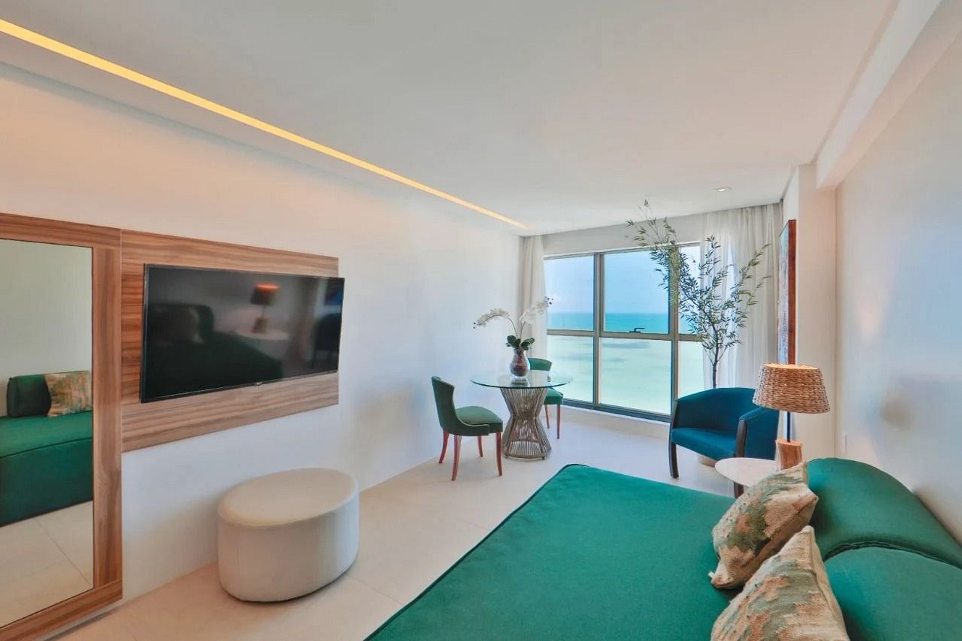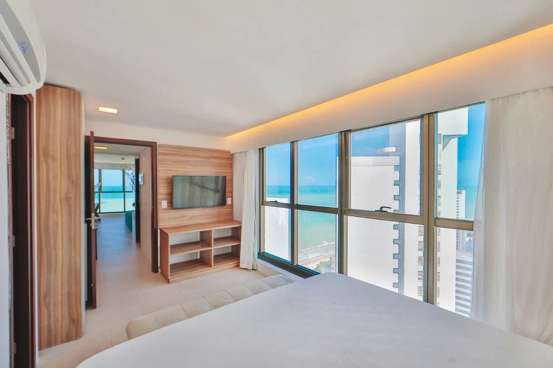Apartamento premium com dois ambientes, com vista para o mar e a cidade, decoração clean. Conta com cama king size, sofá-cama, TV a cabo, Wi-Fi gratuito, frigobar e ar-condicionado. O prédio oferece recepção 24h, academia, sauna, restaurante, estacionamento pago com manobrista, e fica na praia de Boa Viagem, perto de shoppings, restaurantes e bares.