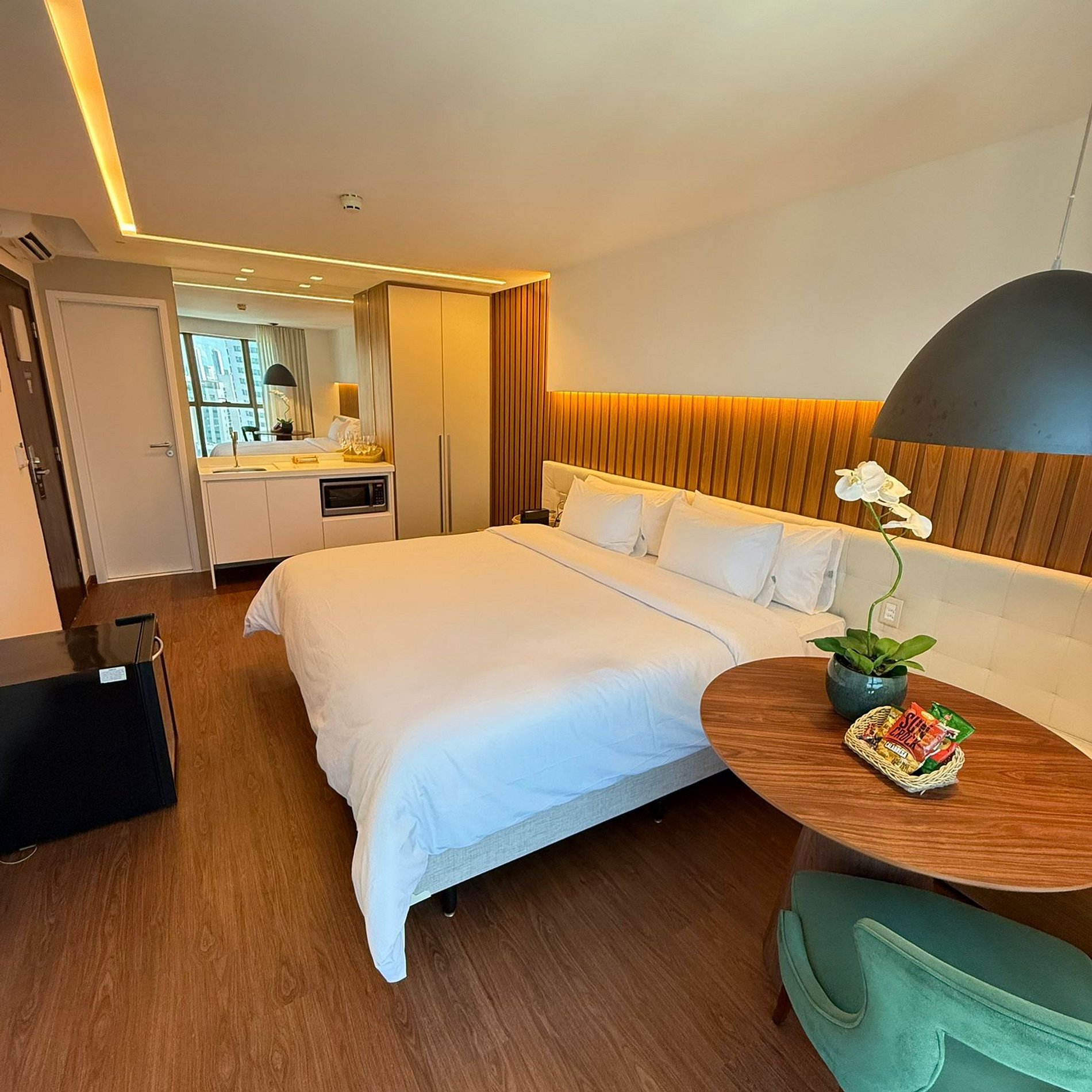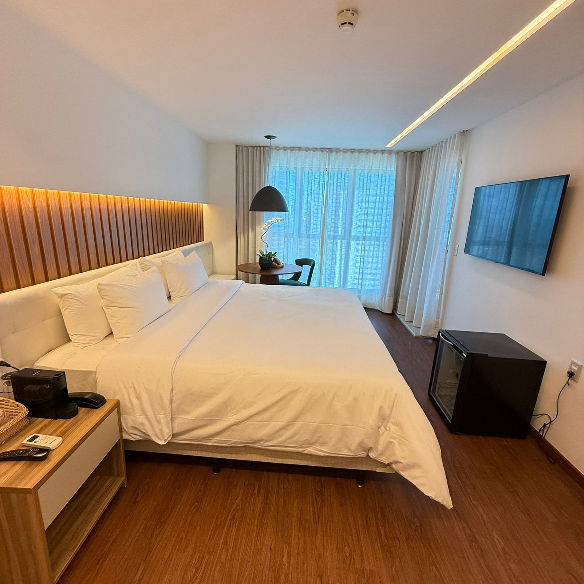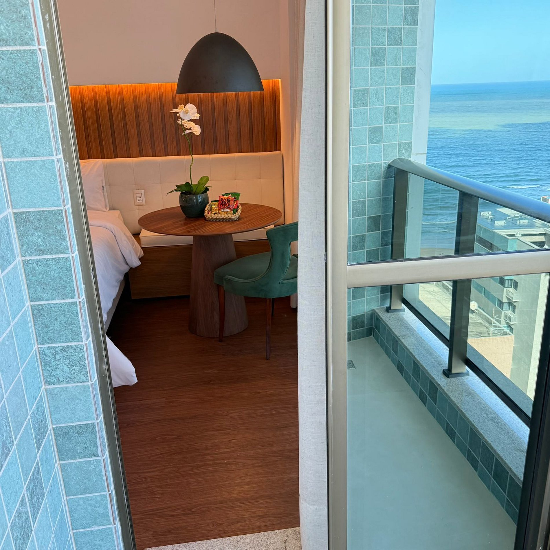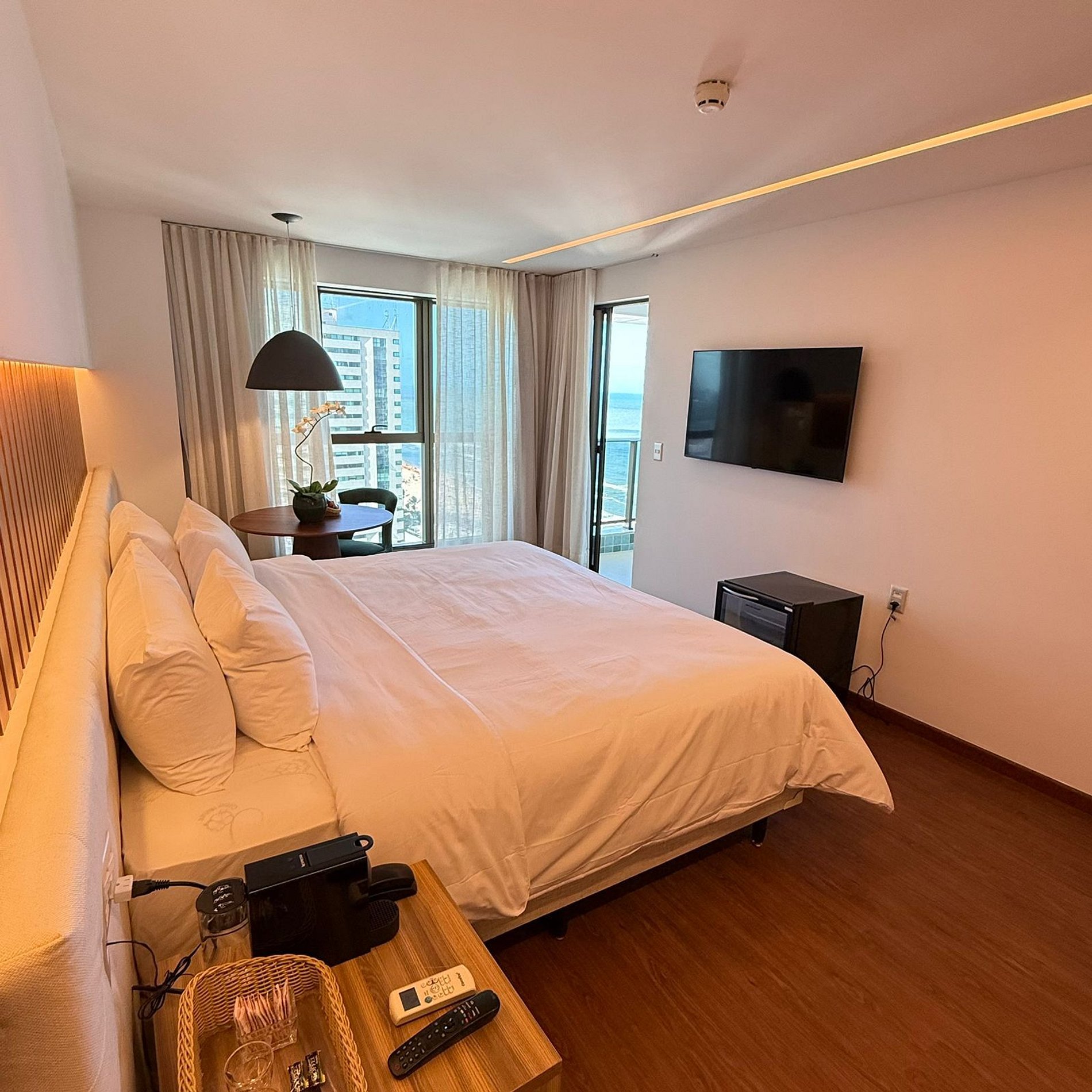 Suíte decorada, com varanda lateral e vista para a Praia de Boa Viagem, no 16º andar. Conta com cama king size, Wi-Fi, Smart TV, ar-condicionado, iluminação aconchegante. Prédio com recepção 24h, restaurante, academia, sauna e estacionamento gratuito. Localização privilegiada, perto dos melhores bares, restaurantes e do Shopping RioMar. Perfeito para lazer ou trabalho.