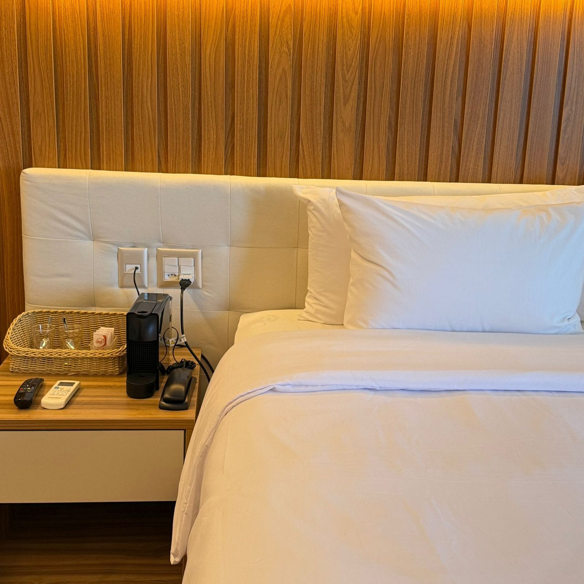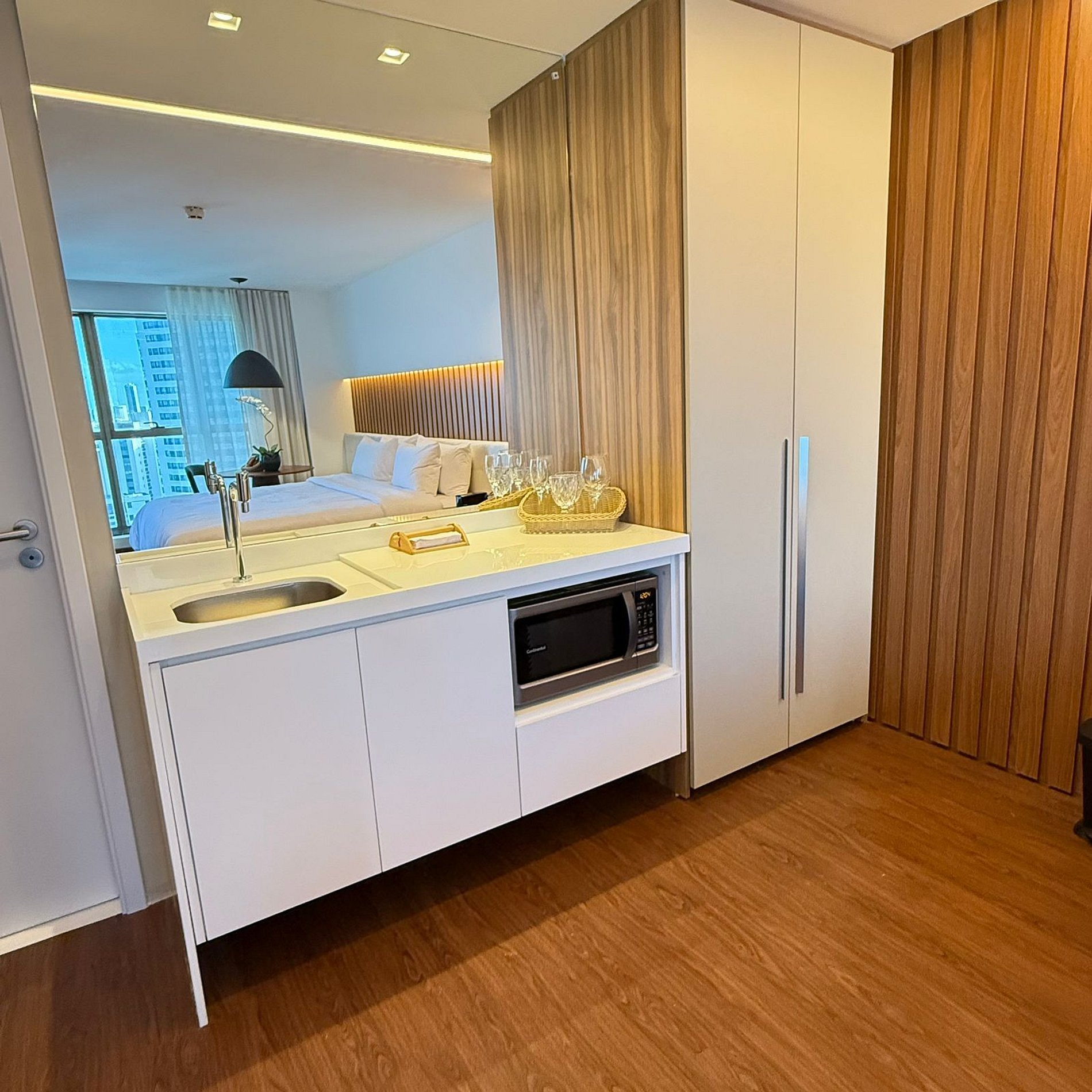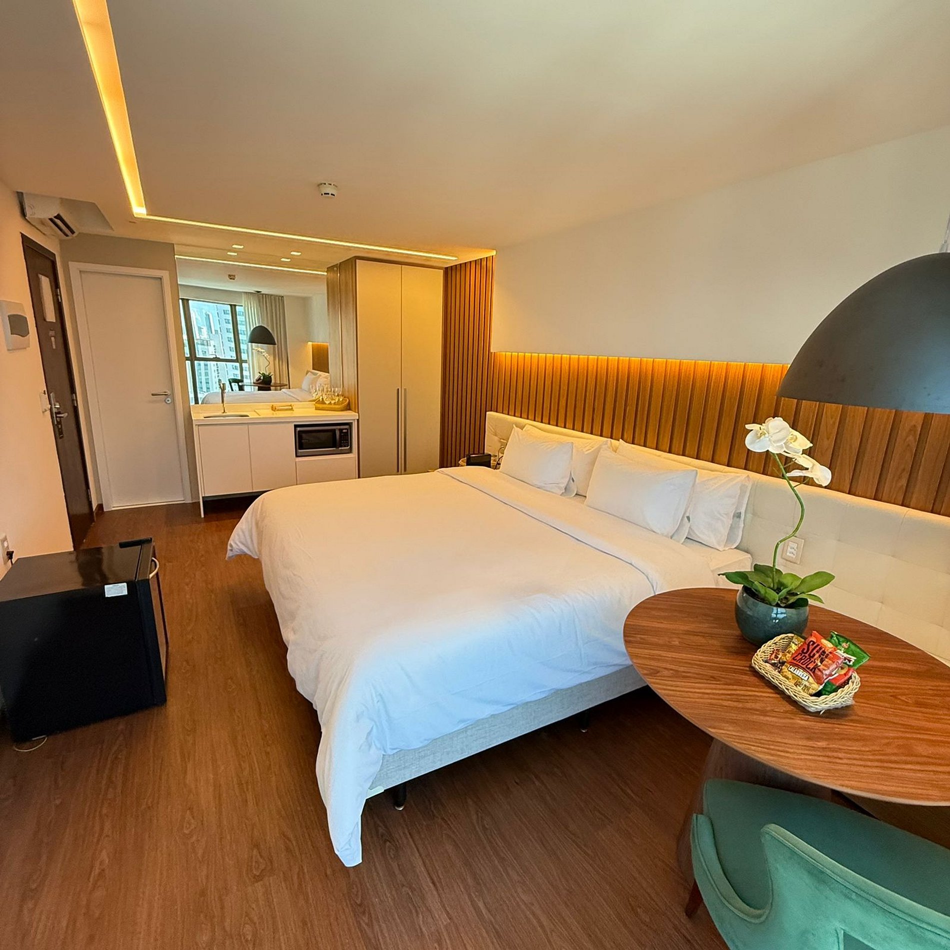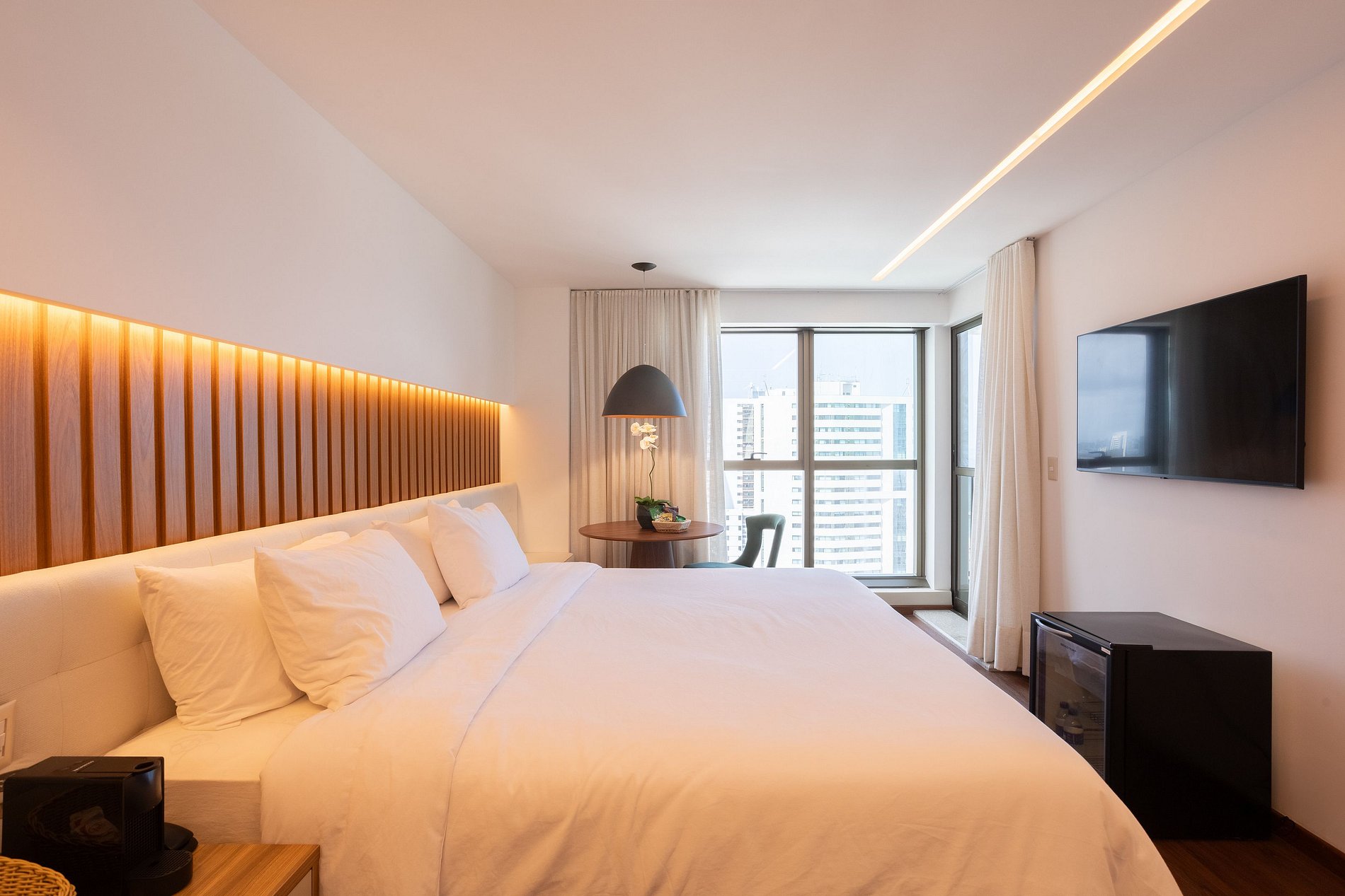 Suíte decorada, com varanda lateral e vista para a Praia de Boa Viagem, no 16º andar. Conta com cama king size, Wi-Fi, Smart TV, ar-condicionado, iluminação aconchegante. Prédio com recepção 24h, restaurante, academia, sauna e estacionamento gratuito. Localização privilegiada, perto dos melhores bares, restaurantes e do Shopping RioMar. Perfeito para lazer ou trabalho.