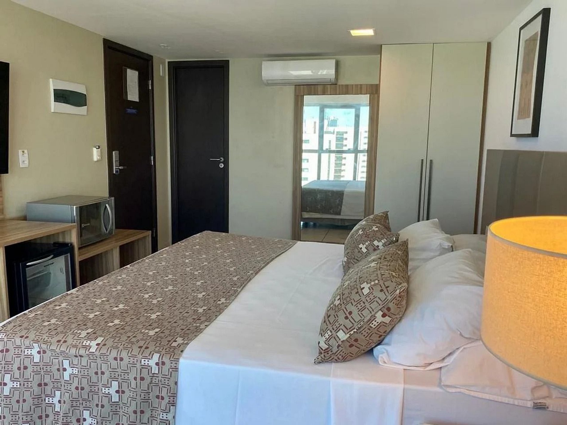 Suíte com varanda lateral, com vista parcial da Praia de Boa Viagem. Conta com cama king size, Wi-Fi, TV a cabo, ar-condicionado, iluminação aconchegante. Prédio com recepção 24h, restaurante, academia, sauna e estacionamento gratuito. Localização privilegiada, perto dos melhores bares, restaurantes e do Shopping RioMar. Perfeito para lazer ou trabalho.