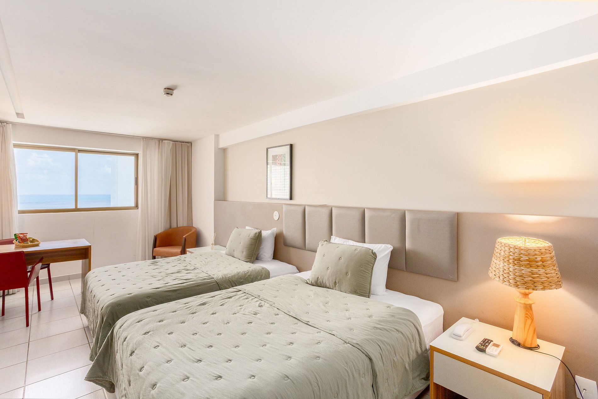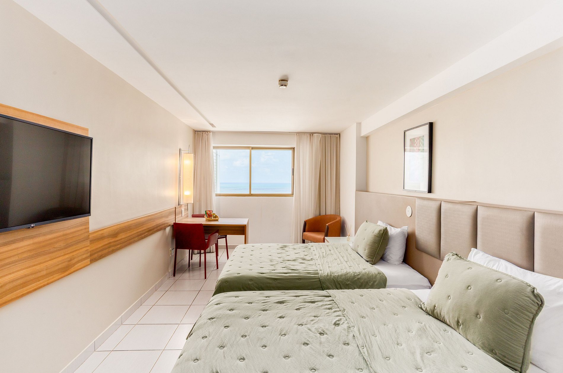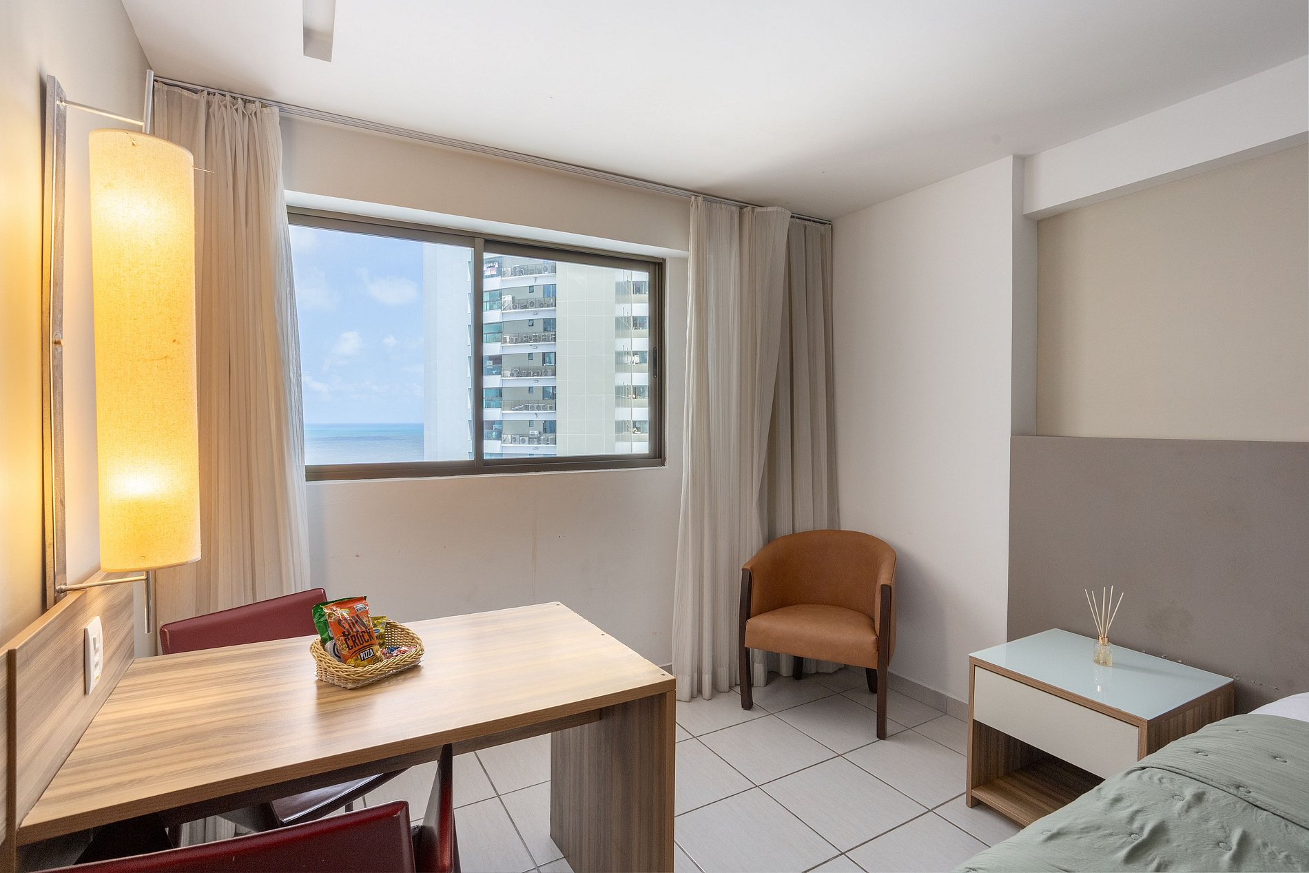 Suíte standard, com vista deslumbrante da Praia de Boa Viagem. Conta com duas camas de casal, Wi-Fi, Smart TV, ar-condicionado, iluminação aconchegante. Prédio com recepção 24h, restaurante, academia, sauna e estacionamento gratuito. Localização privilegiada, perto dos melhores bares, restaurantes e do Shopping RioMar. Perfeito para lazer ou trabalho.
