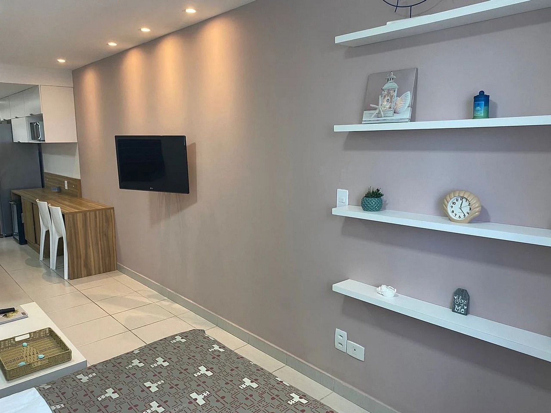 Apartamento com vista para o mar, oferecendo cama de casal, sofá, TV a cabo, sala de estar integrada, sistema de iluminação diferenciado, cortinas com black out, mesa de jantar/trabalho, geladeira, micro-ondas, cooktop e balcão com pia. Wi-Fi gratuito. O prédio conta com recepção bilíngue 24h, academia, sauna, restaurante e estacionamento com manobrista. Localizado na Praia de Boa Viagem, próximo a shoppings, restaurantes, bares, e com conveniências nas proximidades.