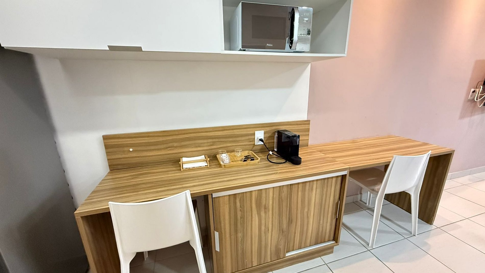 Equipada com frigobar, micro-ondas, cooktop, pia e balcão